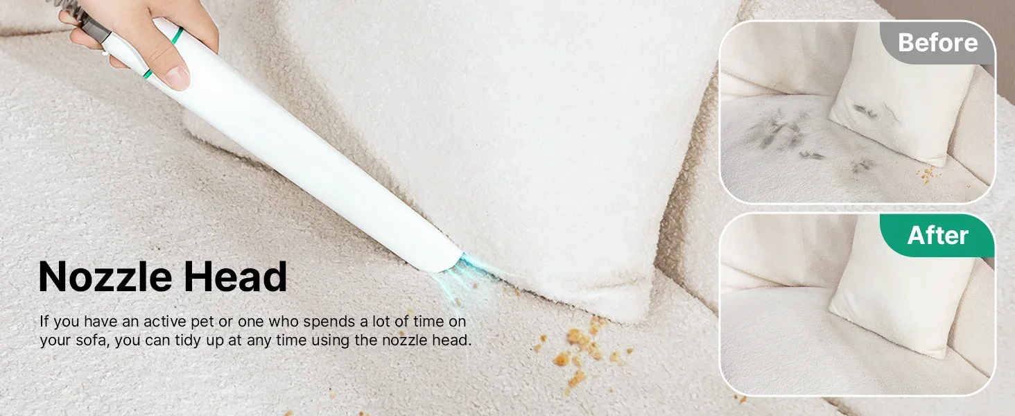 Clean hair and debris from sofa, keyboard, floor, corner, hard-to-reach areas